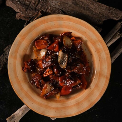 Свинина, крахмал, перец болгарский, морковь, лук, чесночная паста, соус Баатар, кунжут, рис паровой